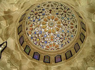 Afterwards, I entered another hall of the haremlek area with more unique mashrabeya screens. The pieces of wood in these screens are designed to be very close to each other, making it impossible for anyone from outside to see through it while enabling the women of the house to look at the street and the sahn. This room was used for women to welcome their guests and friends. Most of the room is decorated with brown and dark red colors, which seemed very feminine and suited the women's section. This area is restricted to women and young children. When a male child got older, it was preferred that he would not enter the room. This hall contained some objects that the women used, such as alabaster dishes and plates. There are two high, stained glass windows that are very attractive.
